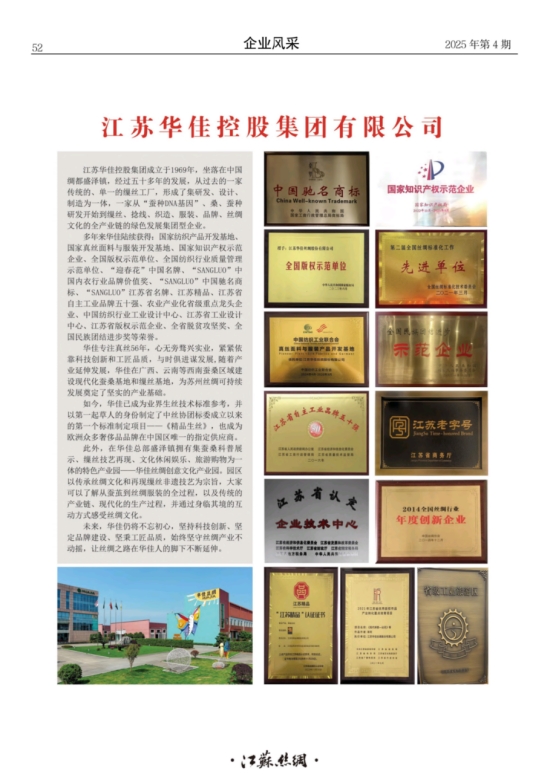 兩代人的匠心傾力把“一根絲”做到極致?!爸挥斜惶蕴钠髽I(yè),沒(méi)有消失的行業(yè)”,王春花說(shuō),品牌是通向市場(chǎng)的路,科技創(chuàng)新是產(chǎn)品和品牌的發(fā)動(dòng)機(jī),只有用匠心精神抓好這兩者,才能讓企業(yè)踏準(zhǔn)市場(chǎng)節(jié)奏,擁有強(qiáng)盛的生命力。從蠶種的培養(yǎng),到對(duì)蠶絲絲長(zhǎng)和彈力的探索,華佳不斷創(chuàng)新、尋找最優(yōu)解。目前,華佳已建立包括國(guó)家級(jí)博士后工作站、江蘇省繭絲改性與加工工程技術(shù)研究中心在內(nèi)的4所相關(guān)研發(fā)機(jī)構(gòu),并以第一起草人的身份制定了中絲協(xié)團(tuán)標(biāo)委成立以來(lái)的第一個(gè)標(biāo)準(zhǔn)制定項(xiàng)目——《精品生絲》,成為業(yè)界生絲技術(shù)標(biāo)準(zhǔn)參考,是歐洲眾多奢侈品品牌在中國(guó)區(qū)的指定供應(yīng)商。