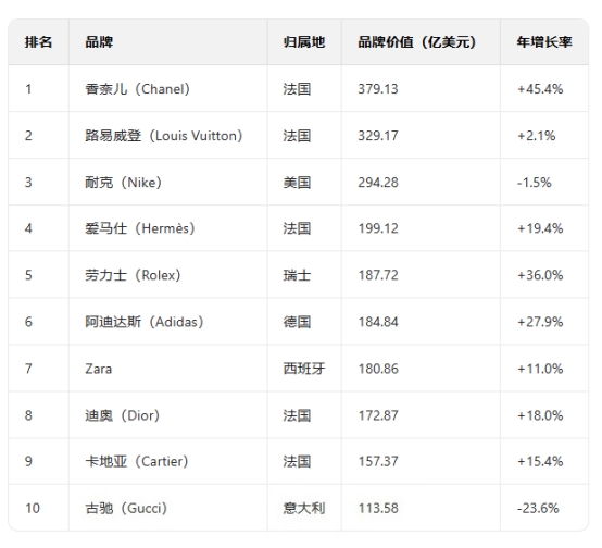 香奈兒登頂,法國(guó)品牌霸榜前十