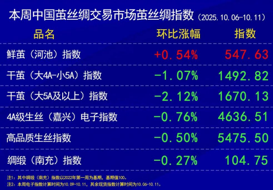 10月以來,處于代表性廣西宜州等地的第三批秋繭上市后期和第四批秋繭上市期,工廠收購價(jià)格多集中在每公斤50-56元之間,受到9月中下旬天氣高溫導(dǎo)致桑葉產(chǎn)量下降、家蠶二分濃核病在桂南、桂中、桂西北蠶區(qū)有所擴(kuò)散等綜合因素影響,10月以來的廣西秋繭上市量下降,毛折普遍較大,凈度普遍偏低。蠶繭原料成本抬升。同時(shí),廣西以外的鮮繭也持續(xù)向廣西集中。根據(jù)協(xié)作單位所報(bào)數(shù)據(jù)轉(zhuǎn)化,鮮繭價(jià)格指數(shù)同比9月末上漲0.54%報(bào)收于547.63點(diǎn)。