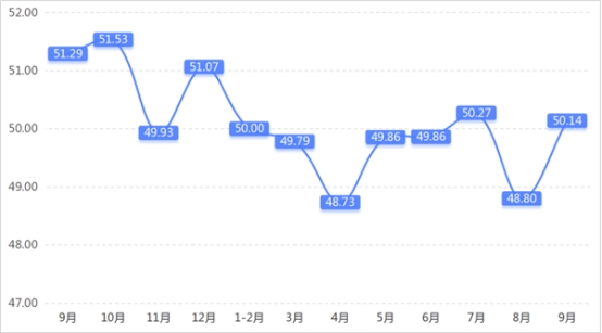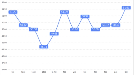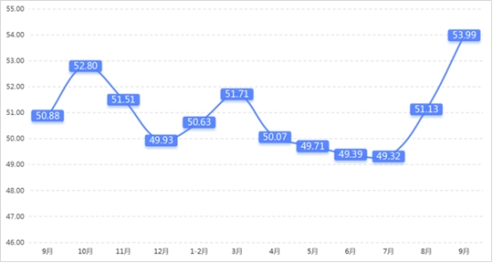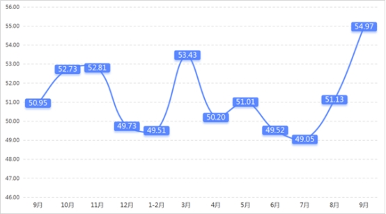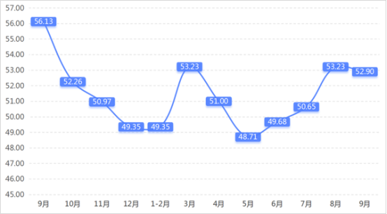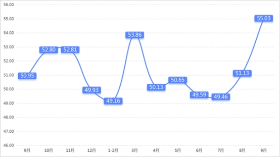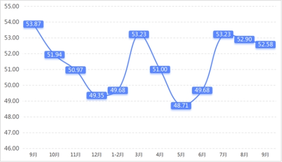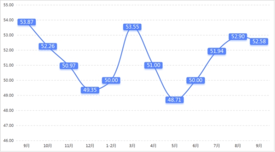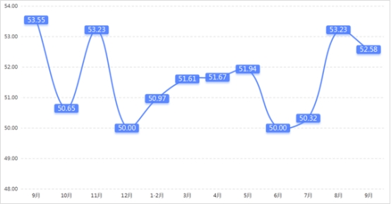 從管理者景氣指數(shù)來看,總指數(shù)中,9月管理者景氣指數(shù)為52.42,較上期上升0.16個百分點;經營環(huán)境指數(shù)為54.84,較上期上升0.65個百分點。