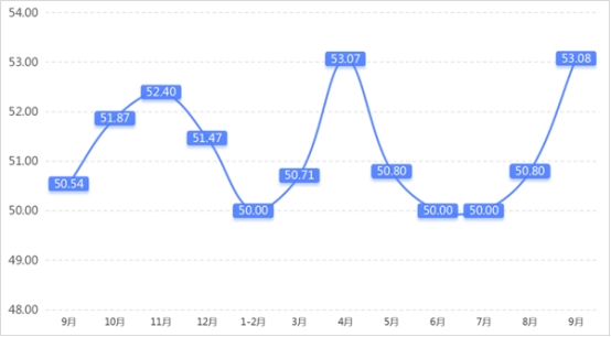 從商戶景氣指數(shù)來看,總指數(shù)中,9月商戶景氣指數(shù)為52.69,較上期上升2.39個百分點;經營環(huán)境指數(shù)為53.57, 較上期上升1.10個百分點。