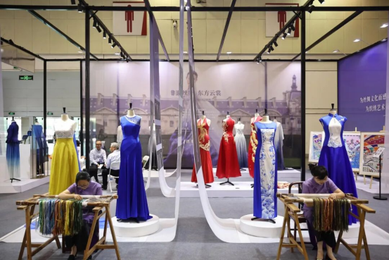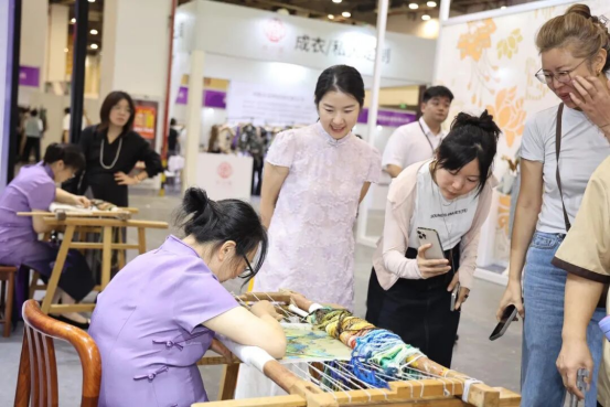 現(xiàn)場,繡娘絲綢非遺蘇繡工藝精彩亮相,讓參展嘉賓近距離感受蘇繡的技藝與魅力。一針一線,一絲一繡,躍然指尖的不僅是傳承千年的技藝,更有中華民族優(yōu)秀的文化底蘊。