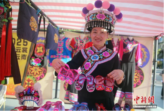 10月13日,商家展示彝繡文創(chuàng)產(chǎn)品