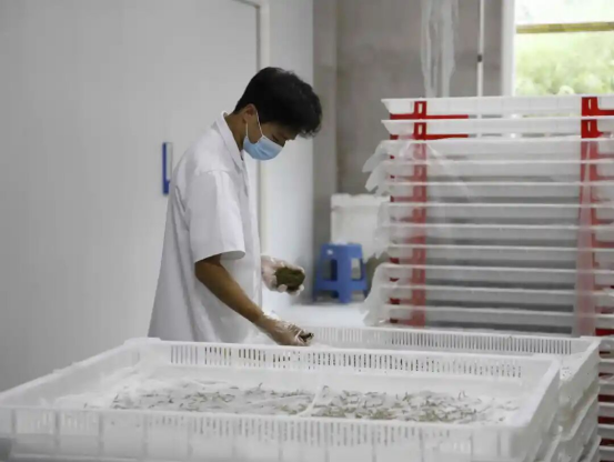 飼料養(yǎng)蠶很大優(yōu)勢在于節(jié)省人力。陳安介紹:“蠶有5個生長齡期,傳統(tǒng)養(yǎng)殖方式下,每天需要桑葉喂養(yǎng)3次,而飼料養(yǎng)殖每一個齡期只喂兩次就夠了,喂一次可以吃兩到三天。”