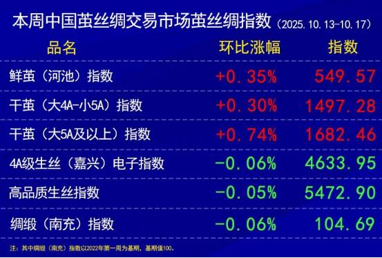 今日(2025年10月17日,周五)中國繭絲綢交易市場生絲電子指數(shù)微跌0.04%收于4633.95點,本周生絲指數(shù)累計下跌0.06%。B絲2022D(商檢4A級生絲):251025合約下跌0.06萬元報收于46.08萬元;260325合約上漲0.03萬元報收于46.65萬元;260925合約下跌0.03萬元報收于46.53萬元。
