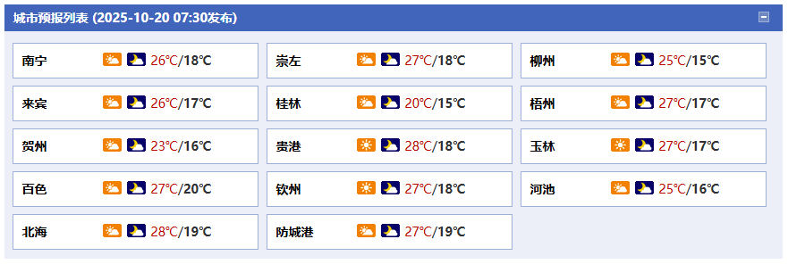 20日白天到晚上,全區(qū)多云到晴,大部有5~6級、陣風7~8級偏北風。各地氣溫:桂東北11~24℃,其它地區(qū)15~27℃。