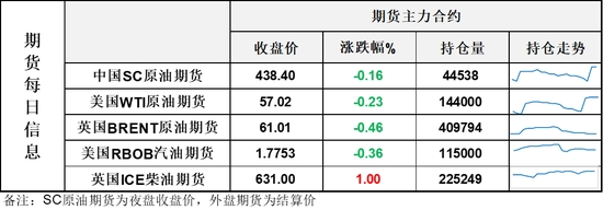 【1】WTI主力原油期貨收跌0.13美元,跌幅0.23%,報(bào)57.02美元/桶;布倫特主力原油期貨收跌0.28美元,跌幅0.46%,報(bào)61.01美元/桶;INE原油期貨收跌0.16%,報(bào)438.4元。
