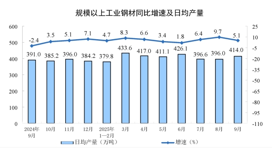 分產(chǎn)品看,9月份,規(guī)模以上工業(yè)623種產(chǎn)品中有362種產(chǎn)品產(chǎn)量同比增長(zhǎng)。其中,鋼材12421萬(wàn)噸,同比增長(zhǎng)5.1%;水泥15444萬(wàn)噸,下降8.6%;十種有色金屬695萬(wàn)噸,增長(zhǎng)2.9%;乙烯299萬(wàn)噸,增長(zhǎng)5.3%;汽車322.7萬(wàn)輛,增長(zhǎng)13.7%,其中新能源汽車158.0萬(wàn)輛,增長(zhǎng)20.3%;發(fā)電量8262億千瓦時(shí),增長(zhǎng)1.5%;原油加工量6269萬(wàn)噸,增長(zhǎng)6.8%。