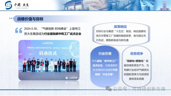 回溯歷程,2023 年,中國紡聯(lián)社會責任辦參與主導制定的《紡織行業(yè)碳中和工廠創(chuàng)建和評價技術規(guī)范》(T/CNTAC 187—2023)正式發(fā)布,填補了紡織行業(yè)碳中和工廠建設的標準空白;2024 年 5 月,大生集團成為該規(guī)范首批試點企業(yè)后,社責辦從政策解讀、落地幫扶到碳中和實施路徑梳理,全程給予專業(yè)指導;同年 7 月項目啟動會、9 月改造工程啟動,社責辦持續(xù)跟進,為工廠建設提供技術與資源支持,助力項目穩(wěn)步推進。