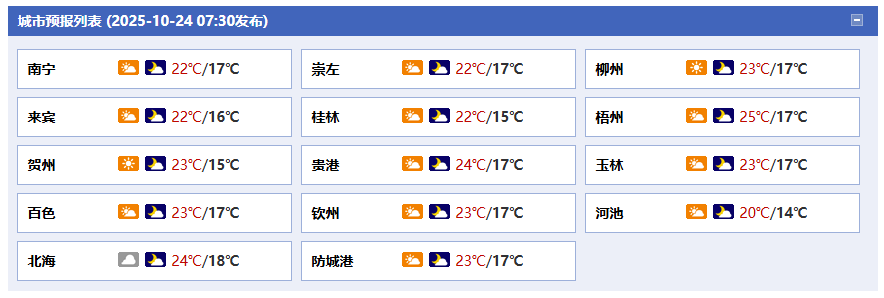 今天白天到晚上,全區(qū)多云到晴,其中百色、河池、崇左、南寧 等市有分散陣雨。各地氣溫:桂北12~23℃,桂南16~26℃。