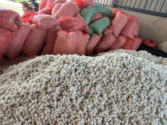 清晨的九甲鎮(zhèn)老街子蠶繭收購點,熱鬧非凡。滿載蠶繭的農(nóng)用車整齊排列,交售隊伍絡(luò)繹不絕。堆積如山的蠶繭宛如一座“雪山”,與忙碌的人群相映成趣,構(gòu)成了一幅“蠶豐人喜樂”的生動畫面。