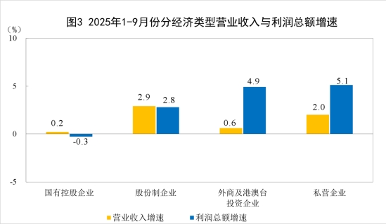 1—9月份,規(guī)模以上工業(yè)企業(yè)中,國有控股企業(yè)實現(xiàn)利潤總額17021.8億元,同比下降0.3%;股份制企業(yè)實現(xiàn)利潤總額39923.5億元,增長2.8%;外商及港澳臺投資企業(yè)實現(xiàn)利潤總額13509.7億元,增長4.9%;私營企業(yè)實現(xiàn)利潤總額15131.7億元,增長5.1%。