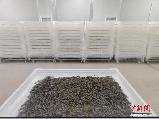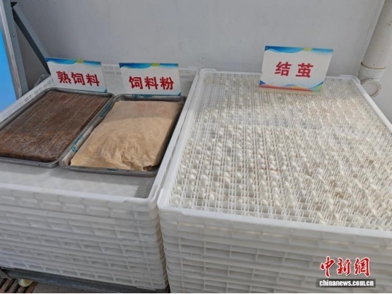 為擺脫這一困境,企業(yè)自2019年起,著手研發(fā)蠶全程飼料喂養(yǎng)與工廠化養(yǎng)殖技術,最終形成一套成熟新模式。蠶從孵化后的蟻蠶到吐絲成繭的成蠶,全程采用飼料喂養(yǎng)。喂料、環(huán)境調控等環(huán)節(jié)均通過機械設備完成,養(yǎng)蠶車間溫度誤差控制在0.5℃以內,濕度誤差不超過5%,產出的蠶繭可直接用于繅制高檔大5A級白廠絲,從源頭保障了產品品質。