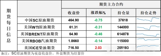【1】WTI主力原油期貨收跌0.19美元,跌幅0.31%,報(bào)61.31美元/桶;布倫特主力原油期貨收跌0.3美元,跌幅0.46%,報(bào)64.9美元/桶;INE原油期貨收跌0.75%,報(bào)464.9元。
