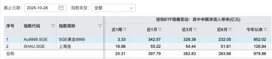 據(jù)Wind統(tǒng)計(jì),10月20日至28日,14只掛鉤實(shí)物金的黃金ETF均實(shí)現(xiàn)了份額增長(zhǎng),總計(jì)增長(zhǎng)8.65億份,且近一周由申贖凈流入帶來(lái)的規(guī)模變化超20億元,近一個(gè)月更是增長(zhǎng)約398億元。