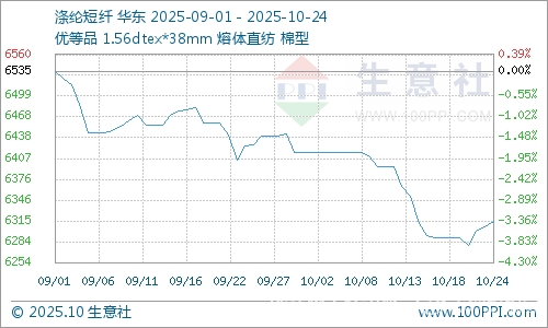 據(jù)商品行情分析系統(tǒng),本周(10月20-24日)國內(nèi)滌綸短纖價格小幅上漲,截止10月24日滌綸短纖(1.4D*38mm)市場均價在6314元/噸,較周初上漲0.38%。