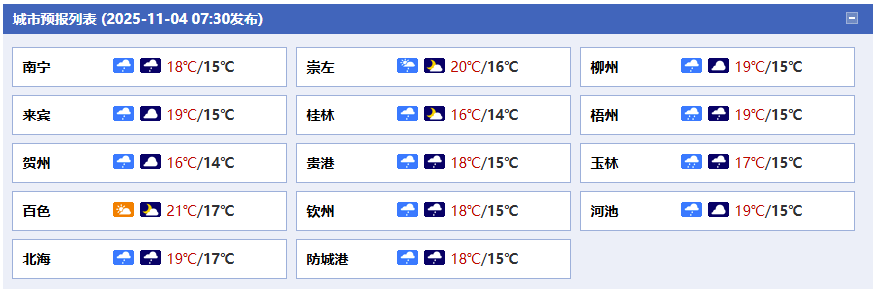 今天白天到晚上,各地氣溫:桂北11~18℃,桂南15~23℃。