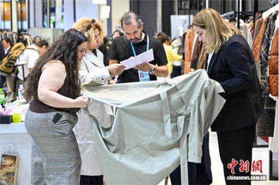 11月1日,境外采購(gòu)商在廣交會(huì)男女裝展區(qū)挑選產(chǎn)品?!≈行律缬浾? 陳驥旻 攝