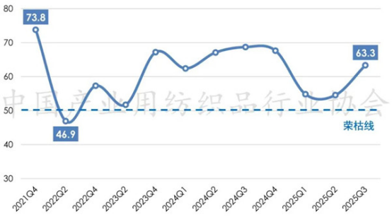 2025年前三季度,全球經(jīng)濟(jì)復(fù)蘇乏力、地緣政治沖突持續(xù)、主要經(jīng)濟(jì)體貨幣政策不確定性猶存;我國經(jīng)濟(jì)運(yùn)行保持穩(wěn)中有進(jìn)態(tài)勢,高質(zhì)量發(fā)展取得積極成效。面對復(fù)雜嚴(yán)峻的外部環(huán)境,我國產(chǎn)業(yè)用紡織品行業(yè)經(jīng)濟(jì)運(yùn)行總體保持平穩(wěn),行業(yè)的生產(chǎn)、經(jīng)濟(jì)效益指標(biāo)增速有所放緩,出口呈現(xiàn)溫和回暖趨勢。根據(jù)中國產(chǎn)業(yè)用紡織品行業(yè)協(xié)會調(diào)研,2025年前三季度我國產(chǎn)業(yè)用紡織品行業(yè)景氣指數(shù)為63.3,較上半年提升8.7個(gè)點(diǎn)(圖1)。