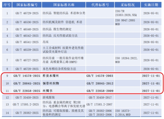 絲綢領(lǐng)域的標(biāo)準(zhǔn)有GB/T 14578-2025 《柞蠶水繅絲》 、GB/T 22858-2025 《絲綢書(shū)》和GB/T 28845-2025 《領(lǐng)帶絲織物》等三項(xiàng)國(guó)標(biāo),實(shí)施日期均為2027年11月1日。