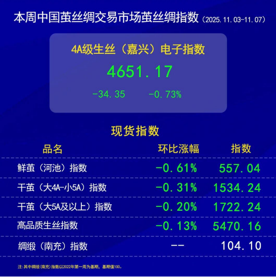 今日(2025年11月07日,周五)中國(guó)繭絲綢交易市場(chǎng)生絲電子指數(shù)下跌0.15%報(bào)收于4651.17點(diǎn),本周生絲指數(shù)累計(jì)下跌0.73%。B絲2022D(商檢4A級(jí)生絲):251125合約下跌0.09萬(wàn)元報(bào)收于46.20萬(wàn)元;260325合約下跌0.12萬(wàn)元報(bào)收于46.74萬(wàn)元;260925合約下跌0.06萬(wàn)元報(bào)收于46.80萬(wàn)元。