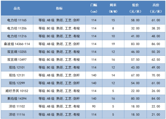 本周綢緞指數(shù)協(xié)作單位成交價(jià)格區(qū)間