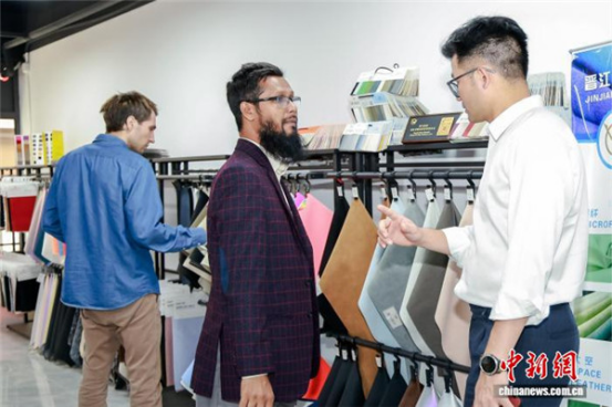 11月6日,第四屆中國晉江國際鞋材采購節(jié)在福建晉江開幕。圖為海外采購商在晉江國際鞋紡城走訪商家、看樣交流