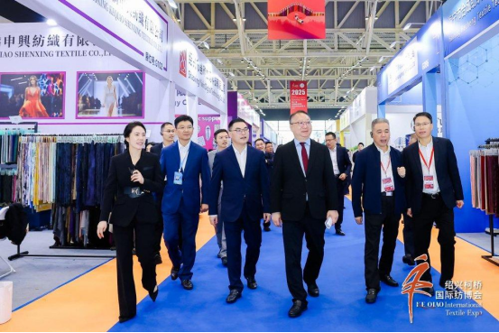 展會期間,中國紡織工業(yè)聯(lián)合會黨委書記、會長孫瑞哲,中國商業(yè)聯(lián)合會副會長馬巍,中國紡織工業(yè)聯(lián)合會秘書長夏令敏,中國紡織工業(yè)聯(lián)合會副會長李陵申、閻巖等行業(yè)領(lǐng)導(dǎo),以及柯橋區(qū)領(lǐng)導(dǎo)袁建、吳海洋、丁貴、李彰等參觀展會現(xiàn)場。在參觀過程中,孫瑞哲一行與參展商和采購商深入交流,詳細(xì)詢問產(chǎn)品研發(fā)、科技創(chuàng)新、市場拓展及智能化生產(chǎn)設(shè)備應(yīng)用等情況,認(rèn)真了解企業(yè)在國際市場開拓、綠色轉(zhuǎn)型實踐與時尚創(chuàng)意設(shè)計等方面取得的創(chuàng)新成果,鼓勵企業(yè)堅定發(fā)展信心、搶抓“雙循環(huán)”機(jī)遇,持續(xù)深化產(chǎn)業(yè)鏈協(xié)同創(chuàng)新,打造競爭優(yōu)勢,探尋發(fā)展增量,不斷提升柯橋紡織的國際影響力和時尚話語權(quán)。
