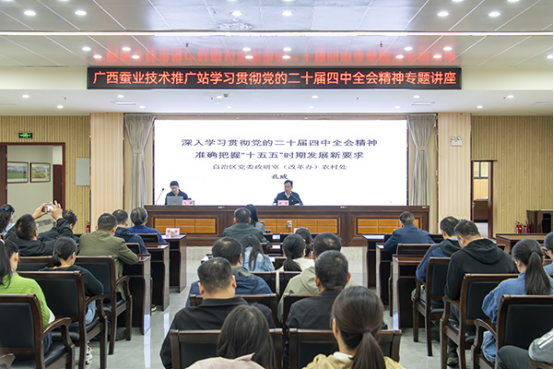 為深入學(xué)習(xí)宣傳貫徹黨的二十屆四中全會(huì)精神,11月11日上午廣西蠶業(yè)技術(shù)推廣站舉辦學(xué)習(xí)貫徹黨的二十屆四中全會(huì)精神專題講座。邀請(qǐng)自治區(qū)黨委政策研究室(改革辦)農(nóng)村處的孔威副處長(zhǎng)授課,講座由廣西蠶業(yè)技術(shù)推廣站書記、站長(zhǎng)卿軍主持,全站在職黨員參加。