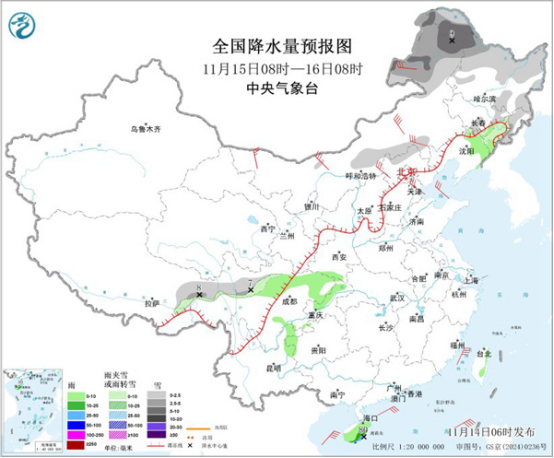 后天,內(nèi)蒙古東部、東北地區(qū)東部和北部、西藏東北部、西北地區(qū)東南部、川西高原北部等地部分地區(qū)有小到中雪或雨夾雪,其中,秦嶺高海拔地區(qū)等地局地有大到暴雪。西北地區(qū)東南部、西南地區(qū)東部、江漢大部、黃淮西部、海南島、臺(tái)灣島東部等地部分地區(qū)有小到中雨,其中,陜西南部、四川盆地東北部、重慶東北部等地部分地區(qū)有大雨。
