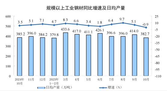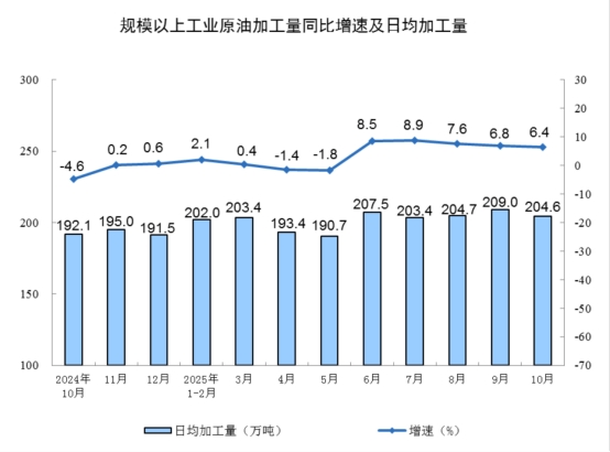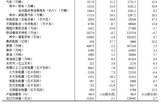 分產(chǎn)品看,10月份,規(guī)模以上工業(yè)623種產(chǎn)品中有313種產(chǎn)品產(chǎn)量同比增長。其中,鋼材11864萬噸,同比下降0.9%;水泥14775萬噸,下降15.8%;十種有色金屬695萬噸,增長2.9%;乙烯314萬噸,增長11.7%;汽車327.9萬輛,增長11.2%,其中新能源汽車171.0萬輛,增長19.3%;發(fā)電量8002億千瓦時,增長7.9%;原油加工量6343萬噸,增長6.4%。