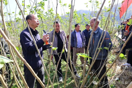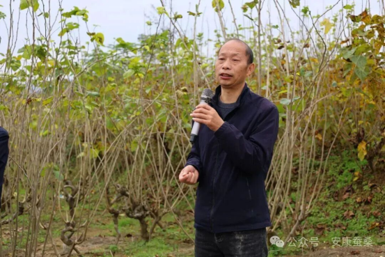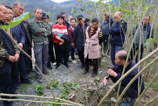 培訓(xùn)會上,賀老師首先聚焦冬季桑園管理的關(guān)鍵環(huán)節(jié),進(jìn)行了詳盡地講解與實(shí)操演示。現(xiàn)場重點(diǎn)演示了桑樹修剪整形的技術(shù)要領(lǐng),詳細(xì)講解了如何因樹修剪、培養(yǎng)豐產(chǎn)樹形;系統(tǒng)指導(dǎo)了清園消毒、科學(xué)施肥的具體方法和注意事項(xiàng),強(qiáng)調(diào)通過清除病蟲枝、合理深施基肥,有效減少病蟲越冬基數(shù),增強(qiáng)樹勢。這種直觀的現(xiàn)場教學(xué)模式,使蠶農(nóng)能夠快速掌握技術(shù)要點(diǎn),解決了冬季管理中遇到的實(shí)際難題,確保了管護(hù)措施精準(zhǔn)到位。同時(shí),就新桑園的選址規(guī)劃、合理栽植密度、優(yōu)良桑樹品種的選擇與搭配以及標(biāo)準(zhǔn)化栽植技術(shù)等核心要點(diǎn)進(jìn)行了詳細(xì)解讀,引導(dǎo)蠶農(nóng)科學(xué)建園,實(shí)現(xiàn)高標(biāo)準(zhǔn)起步,為產(chǎn)業(yè)擴(kuò)張和升級提供支撐。