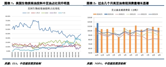 美國財(cái)政部遲遲不公布45Z補(bǔ)貼方案,小煉廠豁免的重新分配方案懸而待決,EPA推遲2026-2027年生物燃料摻混最終方案公布時(shí)間,諸多的政策不確定性令8月以來美豆油期價(jià)持續(xù)承壓。然而,隨著價(jià)格連續(xù)走弱,美豆油性價(jià)比改善明顯,生柴投料性價(jià)比回升帶動其投料占比觸底反彈,食用需求也出現(xiàn)超預(yù)期增長,這顯著體現(xiàn)于今年8-10月美豆油同比大增8.2%的表觀需求,美豆油期價(jià)也在50美分附近覓得支撐。