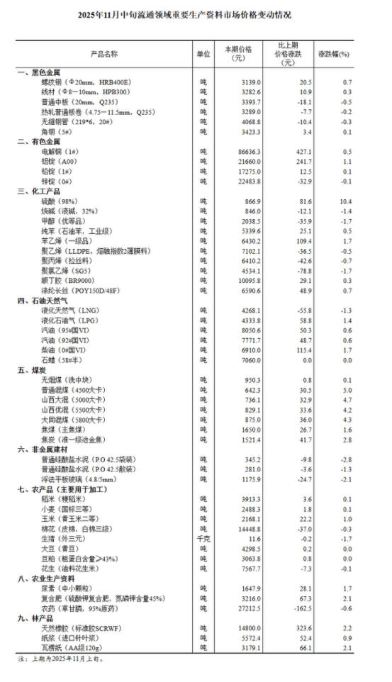 國家統(tǒng)計局24日在官網(wǎng)公布2025年11月中旬流通領(lǐng)域重要生產(chǎn)資料市場價格變動情況。