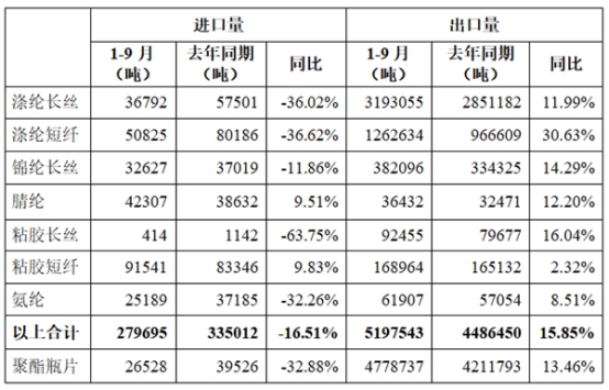 表2 2025年1-9月化纖主要產(chǎn)品進(jìn)出口情況
