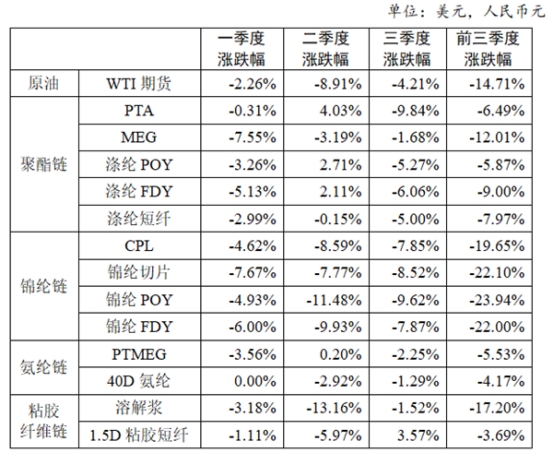 由于原料端支撐減弱,化纖產(chǎn)品市場(chǎng)價(jià)格同比下降。聚酯鏈方面,一季度纖維產(chǎn)品價(jià)格跌幅普遍大于其原料跌幅,壓縮盈利空間;二季度纖維產(chǎn)品價(jià)格雖上漲,但漲幅普遍不及其原料漲幅,再度壓縮盈利空間;三季度纖維產(chǎn)品價(jià)格雖處于下滑趨勢(shì),但其原料降幅更為明顯,加工差有所擴(kuò)大(圖3)。錦綸鏈方面,前三季度各環(huán)節(jié)價(jià)格下滑態(tài)勢(shì)明顯,跌幅均在20%左右(圖4、表1)。