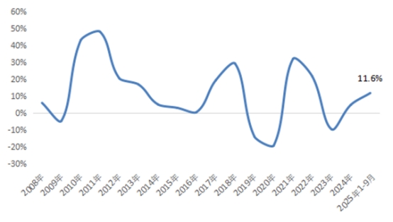 根據(jù)國(guó)家統(tǒng)計(jì)局?jǐn)?shù)據(jù),2025年1-9月化纖產(chǎn)量同比增長(zhǎng)5.6%,產(chǎn)量增速較2024年同期和全年均有所放緩,但較1-6月小幅提升0.69個(gè)百分點(diǎn),總體來(lái)看基本保持平穩(wěn)(圖1)。