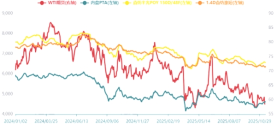 圖3 2024年以來(lái)國(guó)際油價(jià)、PTA、滌綸POY、滌綸短纖價(jià)格走勢(shì)