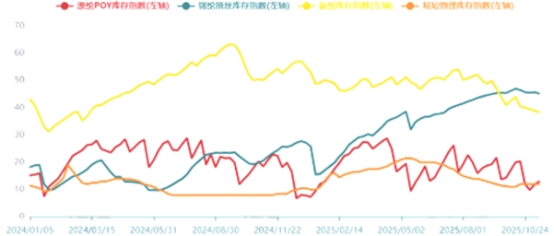 庫(kù)存方面,滌綸長(zhǎng)絲受益于5月中旬企業(yè)集中安排停產(chǎn)檢修,5、6月庫(kù)存去化進(jìn)程加快,7月庫(kù)存有所回升并在中旬達(dá)到26天(以POY為例),此后呈現(xiàn)震蕩下降趨勢(shì),10月末降至9天(圖2)。錦綸庫(kù)存大幅增加,雖然二、三季度減產(chǎn)幅度擴(kuò)大,但僅是減緩了庫(kù)存上升的速度,10月末升至46天。氨綸庫(kù)存則延續(xù)2024年下半年以來(lái)的高位震蕩態(tài)勢(shì),上半年基本維持在50天左右;7月下旬庫(kù)存出現(xiàn)下降趨勢(shì),10月末降至40天。