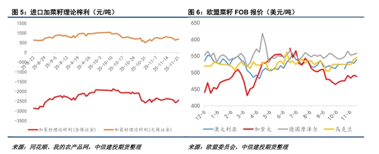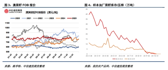 第1條澳菜籽通關(guān)后,市場(chǎng)觀察重點(diǎn)將轉(zhuǎn)到是否有更多企業(yè)獲批進(jìn)口澳洲菜籽,商業(yè)買船的開放潛力將直接影響澳菜籽壓榨利潤(rùn)定價(jià)邏輯的兌現(xiàn)程度。就目前階段而言,如果澳菜籽進(jìn)口僅發(fā)生在少數(shù)企業(yè)上,那么26年菜籽壓榨也將同比明顯下滑。另一方面,對(duì)于澳大利亞而言,目前鹿特丹、巴基斯坦等地的菜籽報(bào)價(jià)或相較于中國(guó)仍有一定溢價(jià),短期內(nèi)中國(guó)市場(chǎng)更多是作為補(bǔ)充,而非主要銷區(qū)。