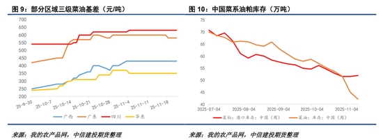 截止到目前,加菜籽累計(jì)出口154.4萬(wàn)噸,同比下降55%,出口壓力依然嚴(yán)峻。但另一方面,ICE菜籽也對(duì)中加經(jīng)貿(mào)題材階段性脫敏,維持區(qū)間震蕩態(tài)勢(shì)。對(duì)于加菜籽而言,近期更關(guān)鍵的是美國(guó)市場(chǎng)RVO能否如期執(zhí)行,以及對(duì)進(jìn)口原料的RINS計(jì)算規(guī)則。對(duì)國(guó)內(nèi)來(lái)說(shuō),加菜籽對(duì)01合約的直接影響或轉(zhuǎn)弱,即便近期中加菜籽貿(mào)易能夠恢復(fù),加菜籽恢復(fù)出口并到達(dá)中國(guó)入榨也將擱置到26年1月之后?,F(xiàn)階段更關(guān)鍵的仍然是近端澳菜籽到港入榨時(shí)間,以及俄菜油的到港數(shù)量。