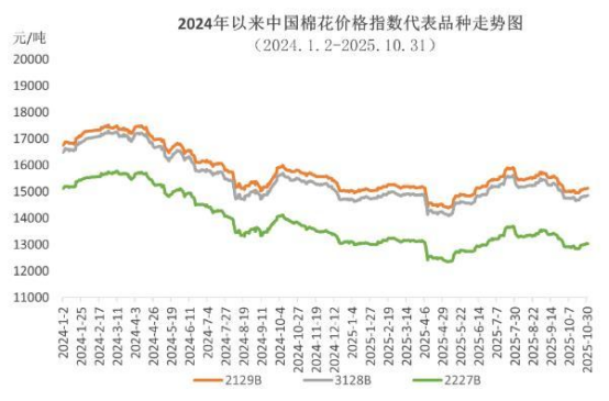 10月,新年度棉花陸續(xù)上市,月初因新疆棉花豐產(chǎn)已成定局,國(guó)內(nèi)棉花現(xiàn)貨價(jià)格延續(xù)弱勢(shì)震蕩下行;月中下旬,二十屆四中全會(huì)召開(kāi),提出“十五五”時(shí)期經(jīng)濟(jì)社會(huì)發(fā)展的主要目標(biāo),提振市場(chǎng)信心,推動(dòng)國(guó)內(nèi)棉價(jià)持續(xù)反彈。中國(guó)棉花價(jià)格指數(shù)(CCIndex3128B)月內(nèi)最低下跌至14664元/噸,月底收于最高點(diǎn)14860元/噸,月均價(jià)14764元/噸,環(huán)比下跌480元,同比下跌764元。