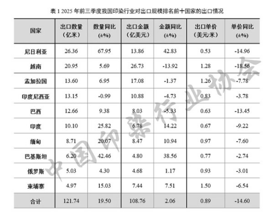 面對復(fù)雜的全球貿(mào)易環(huán)境,我國印染企業(yè)積極調(diào)整產(chǎn)品結(jié)構(gòu),持續(xù)拓展“一帶一路”沿線國家和非洲等國際市場。前三季度,我國印染行業(yè)出口規(guī)模排名前十的國家出口數(shù)量121.74億米,同比增長19.50%,高于整體增速7.20個(gè)百分點(diǎn),其中,對尼日利亞、巴基斯坦、印度出口數(shù)量分別大幅增長67.95%、42.46%和25.82%,對緬甸和柬埔寨出口數(shù)量增速均高于對全球出口整體增速。對前十國家的出口平均單價(jià)降幅高于整體水平3.81個(gè)百分點(diǎn),其中對越南、尼日利亞和巴西出口平均單價(jià)降幅分別達(dá)到18.56%、14.96%和13.45%。