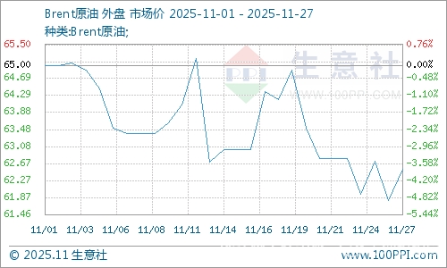 歐佩克+新一輪增產(chǎn),原油市場依然擔憂長線的供應過剩風險,地區(qū)局勢有所緩和,加之美國需求減弱,美國關稅問題拖累全球經(jīng)濟和需求預期,導致國際原油價格震蕩下滑。截止11月26日,美國WTI原油期貨1月合約結算價報58.65美元/桶,布倫特原油期貨2月合約結算價報62.54美元/桶。