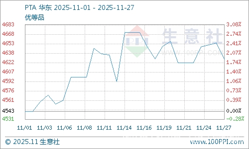 供需格局階段性改善,11月份PTA價格震蕩上行,據(jù)生意社商品行情分析系統(tǒng),11月份國內(nèi)PTA市場行情小幅上行,后半月僵持整理。截止11月26日國內(nèi)華東地區(qū)PTA現(xiàn)貨價格在4628元/噸,較月初上漲1.86%。