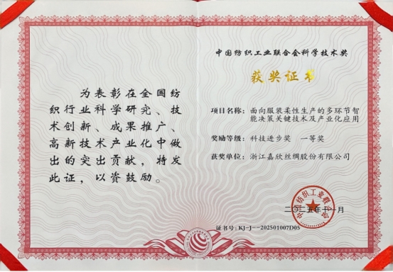 這是嘉欣絲綢首次獲得中國(guó)紡織行業(yè)的最高科技榮譽(yù),這份沉甸甸的獎(jiǎng)項(xiàng),不僅是一份榮耀,更是對(duì)嘉欣絲綢在服裝生產(chǎn)數(shù)智化轉(zhuǎn)型道路上創(chuàng)新與實(shí)踐的國(guó)家級(jí)權(quán)威認(rèn)可。