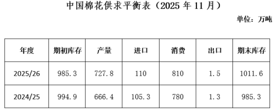 中國棉花協(xié)會預測:2025/26年度全國棉花產(chǎn)量727.8萬噸,同比增長9.2%;棉花進口量110萬噸,同比增長4.5%;消費量810萬噸,同比增長3.8%,期末庫存為1011.6萬噸,同比增長2.7%。