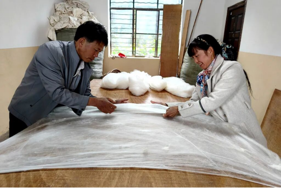 作為阿都鄉(xiāng)的手工蠶絲被老手藝人,他們每年4月份就著手養(yǎng)蠶,經(jīng)過45天的育苗、育蠶、結(jié)繭化蛹就可以采繭,再經(jīng)過煮繭、清洗、抽絲拉綿、晾曬,便可以進(jìn)行蠶絲被的制作。