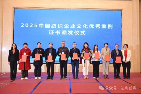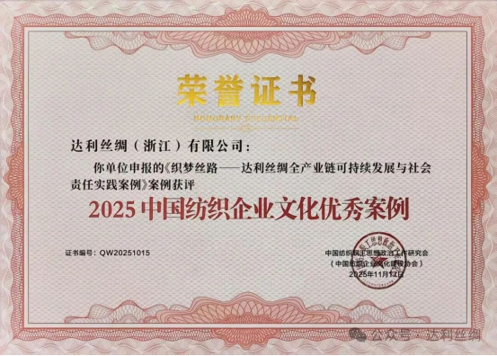 近日,以 “育文化強(qiáng)基 啟紡織未來” 為主題的 2025 中國紡織企業(yè)文化大會(huì)在江西南昌舉行,達(dá)利絲綢憑借《織夢(mèng)絲路 —— 達(dá)利絲綢全產(chǎn)業(yè)鏈可持續(xù)發(fā)展與社會(huì)責(zé)任實(shí)踐案例》,憑借 “文化 + AI + 綠色” 的創(chuàng)新融合模式,獲評(píng) “2025 中國紡織企業(yè)文化優(yōu)秀案例”,獲行業(yè)高度認(rèn)可。