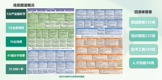 該圖譜全面覆蓋紡織產(chǎn)業(yè)鏈的研發(fā)設(shè)計(jì)、生產(chǎn)制造、經(jīng)營(yíng)管理三大業(yè)務(wù)領(lǐng)域,系統(tǒng)梳理出50個(gè)主場(chǎng)景和41個(gè)細(xì)分場(chǎng)景,每個(gè)場(chǎng)景均包含現(xiàn)狀評(píng)級(jí)、數(shù)據(jù)要素、知識(shí)模型、技術(shù)工具、人才技能及痛點(diǎn)問題關(guān)鍵要素,為行業(yè)制定標(biāo)準(zhǔn)和推進(jìn)應(yīng)用落地提供了權(quán)威的理論基礎(chǔ)和方法,使紡織服裝企業(yè)的數(shù)字化轉(zhuǎn)型之路更清晰、更高效。